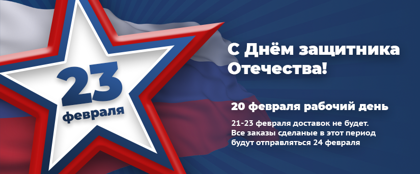 21, 22 и 23 февраля - выходные дни. Заказы оформленные в период с 20.02 по 23.02 будут отправлены 24 февраля.